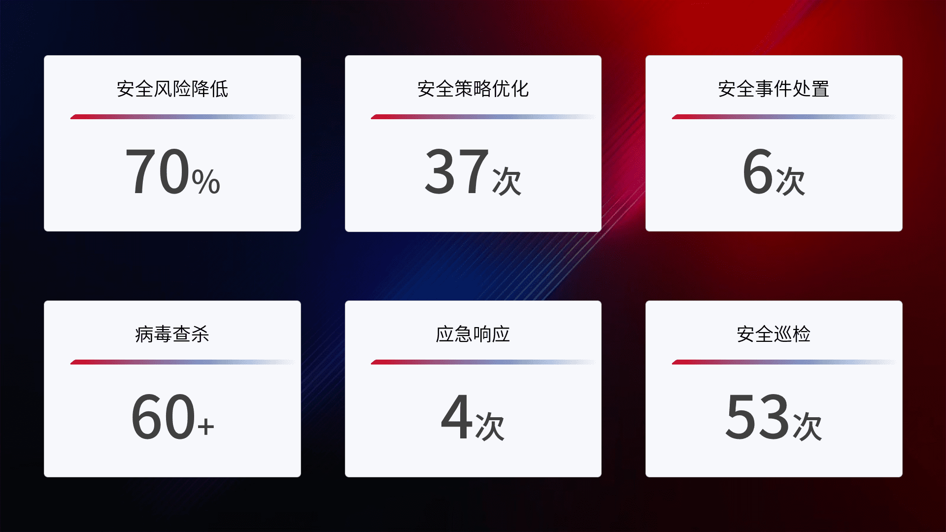 提供全面的安全事件报告体系,,,包括处置报告、、、周报、、、、季度和年度总结,,,结合持续监控,,帮助客户深入了解网络安全状况。。。。