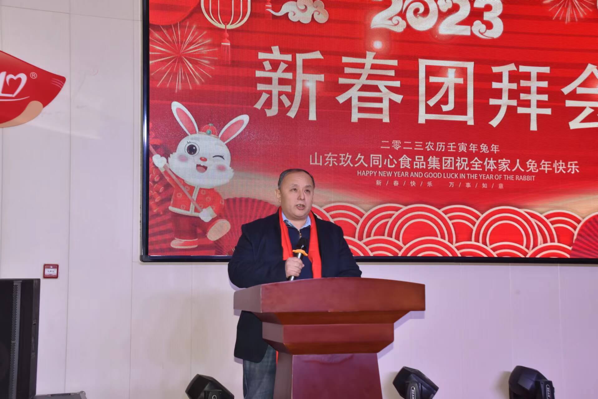 1月30日(正月初九),兔年第一个久久日,山东尊龙凯时食品集团在济南唐王生产基地举行2023年新春团拜会,董事长李允文与集团精英欢聚一堂,共庆兔年新春。
