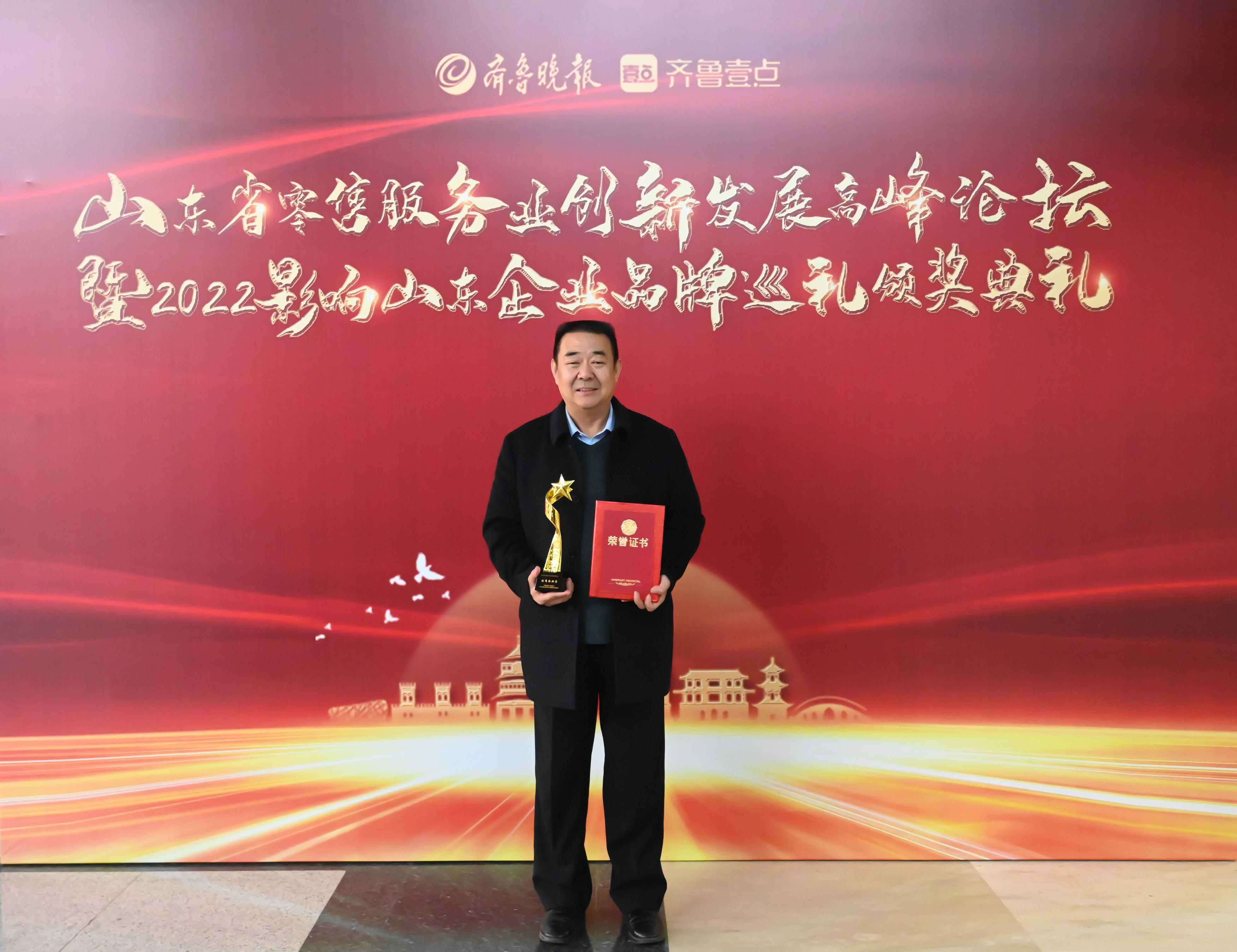 1月31日,由齐鲁晚报·齐鲁壹点主办的“山东省零售服务业创新发展高峰论坛暨2022影响山东企业品牌巡礼”颁奖典礼在济南市舜耕山庄舜耕会堂拉开帷幕。山东尊龙凯时食品集团董事长李允文应邀出席颁奖盛典并登台领奖。